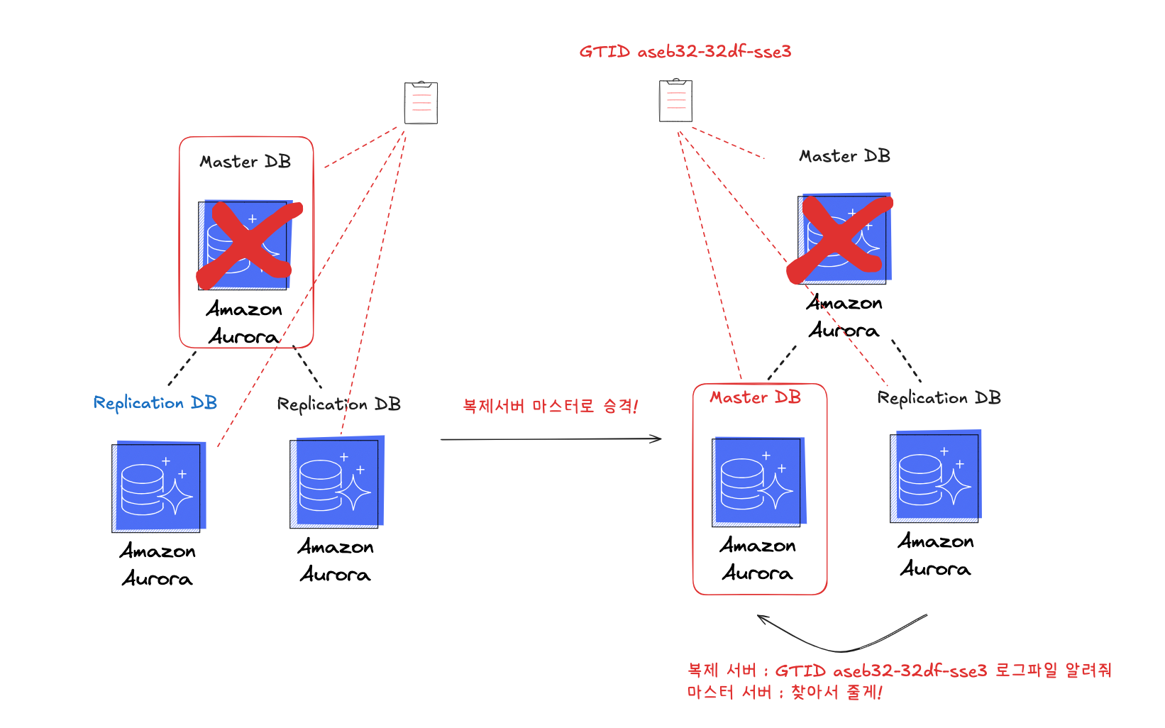 하지만 바이너리 로그 파일 위치 기반 복제는 마스터 서버에 장애가 발생했을때 문제가 발생할 수 있습니다. 장애가 발생하기전 마스터 서버에만 바이너리 로그 파일을 소유하고, 장애 발생으로 인해 레플리카 서버가 마스터로 승격하였을때, 해당 마스터 서버에는 바이너리 로그 파일을 가지고 있지 않는 동기화 이슈가 있습니다. 즉, 특정 복제 이벤트가 다른 데이터베이스에서 동일한 위치에 저장되는 것이 보장되지 않습니다. 따라서 장애가 발생하면 오히려 데이터 복구를 어렵게 만들수 있습니다.