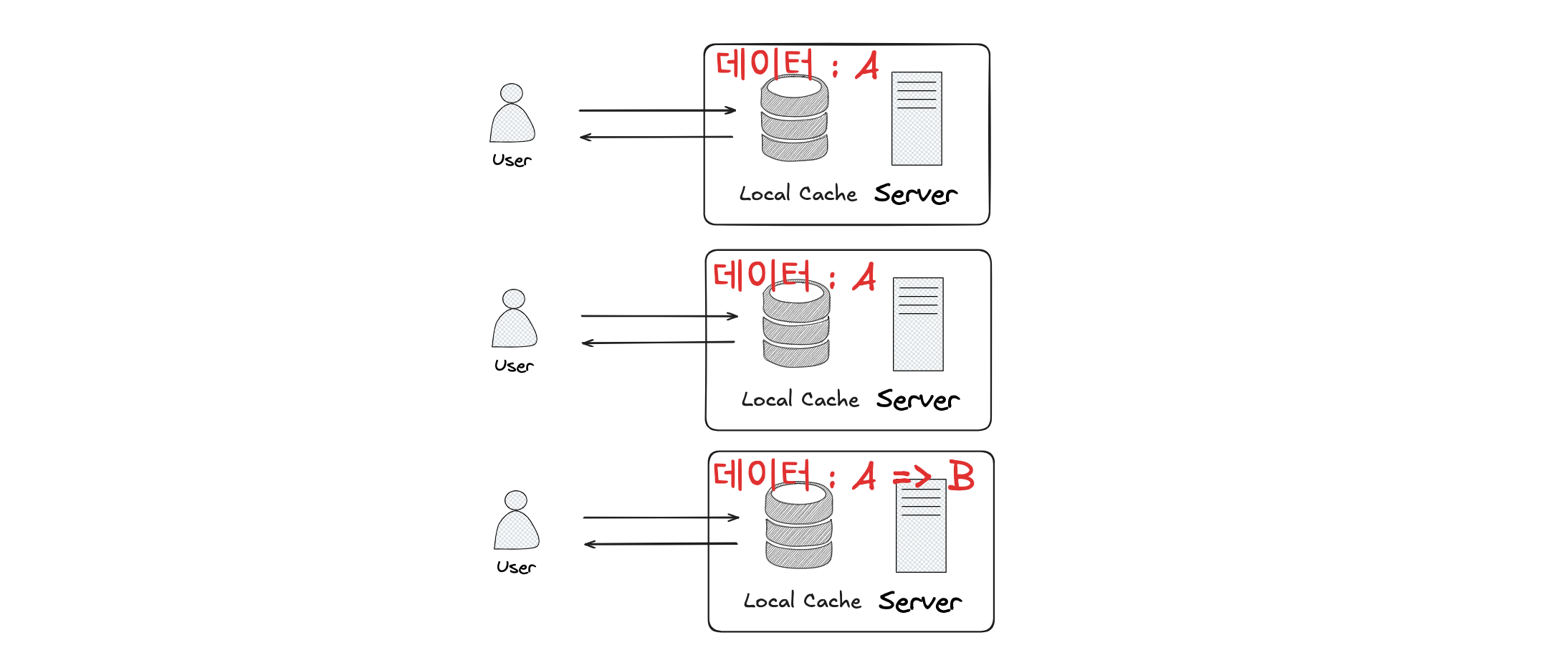 하이브리드 캐시를 사용하더라도 여전히 문제가 있습니다. 바로 로컬캐시에 저장된 데이터가 변경이 되었을때, 다른 서버에 저장된 로컬 캐시와 데이터가 동일하지 않다는 문제가 있습니다. 이러한 이슈는 하이브리드 캐시라서 발생하는 것이 아닌 로컬 캐시가 가지는 고유한 단점 입니다. 로컬 캐시는 에러를 추적하기도 쉽지 않기 때문에 데이터 동기화 이슈가 발생한다면 어디서 잘못된 것인지 추적하기도 쉽지 않습니다. 즉, 로컬캐시에 저장된 데이터를 변경하기 위해서는 만료 프로세스가 필요합니다.