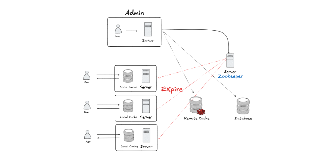 카카오 선물하기 팀에서는 주키퍼를 활용하여 데이터 변경이 감지 되면 각 서버에 이벤트를 발행하여 캐시들을 만료 처리하도록 한다. 이때 당연하겠지만 원격 캐시와 데이터베이스의 데이터도 같이 업데이트 하거나 제거한다.