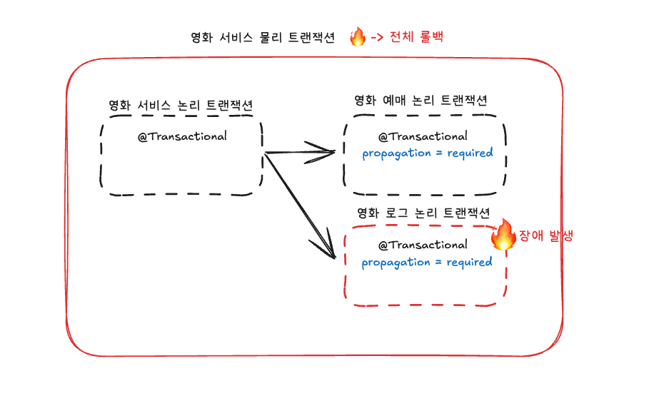 영화를 예매하는 로직에서 로그를 저장하는 서비스에서 장애가 발생하면 어떻게 될까요? 일반적인 상황에서는 propagation이 required라서 전체 롤백이 진행 됩니다.