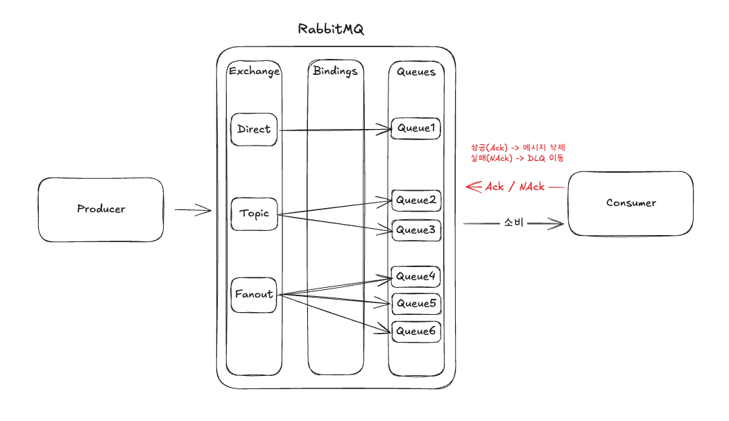 - Consumer는 메시지 처리 후 ACK(확인) 또는 NACK(실패) 응답을 반환