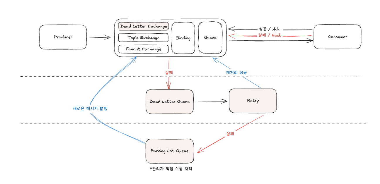 Retry는 일종의 DLQ를 담당하는 Consumer라고 생각하시면 됩니다. DLQ에 적재된 메시지를 재처리 과정을 통해 다시 정상적인 Exchange 전략과 Queue로 메시지를 다시 보내, 정상 흐름으로 복귀시키는 구조입니다.
