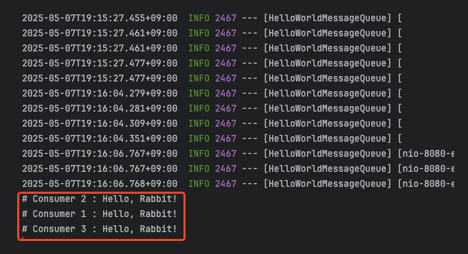 그리고 각 Consumer에서는 전달 받은 메시지를 출력하도록 구성하였습니다.