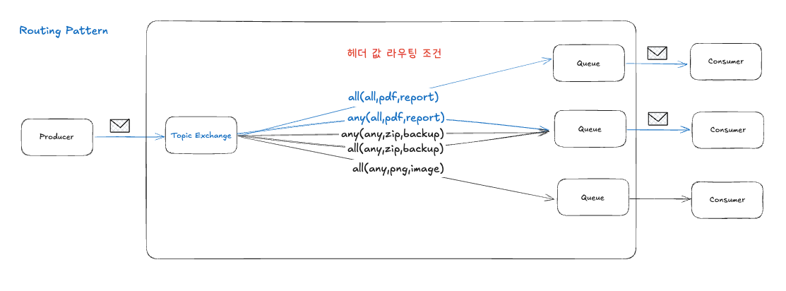 - 동작 : 메시지의 헤더(key-value)에 따라 큐에 라우팅