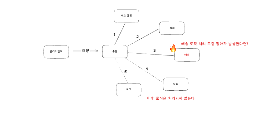 하나의 주문 요청이 들어오면 주문 → 결제 → 배송 → 알림 등 여러 처리를 하나의 긴 트랜잭션 안에서 처리해야 합니다. 하지만 이런 구조는 다음과 같은 문제를 만듭니다.