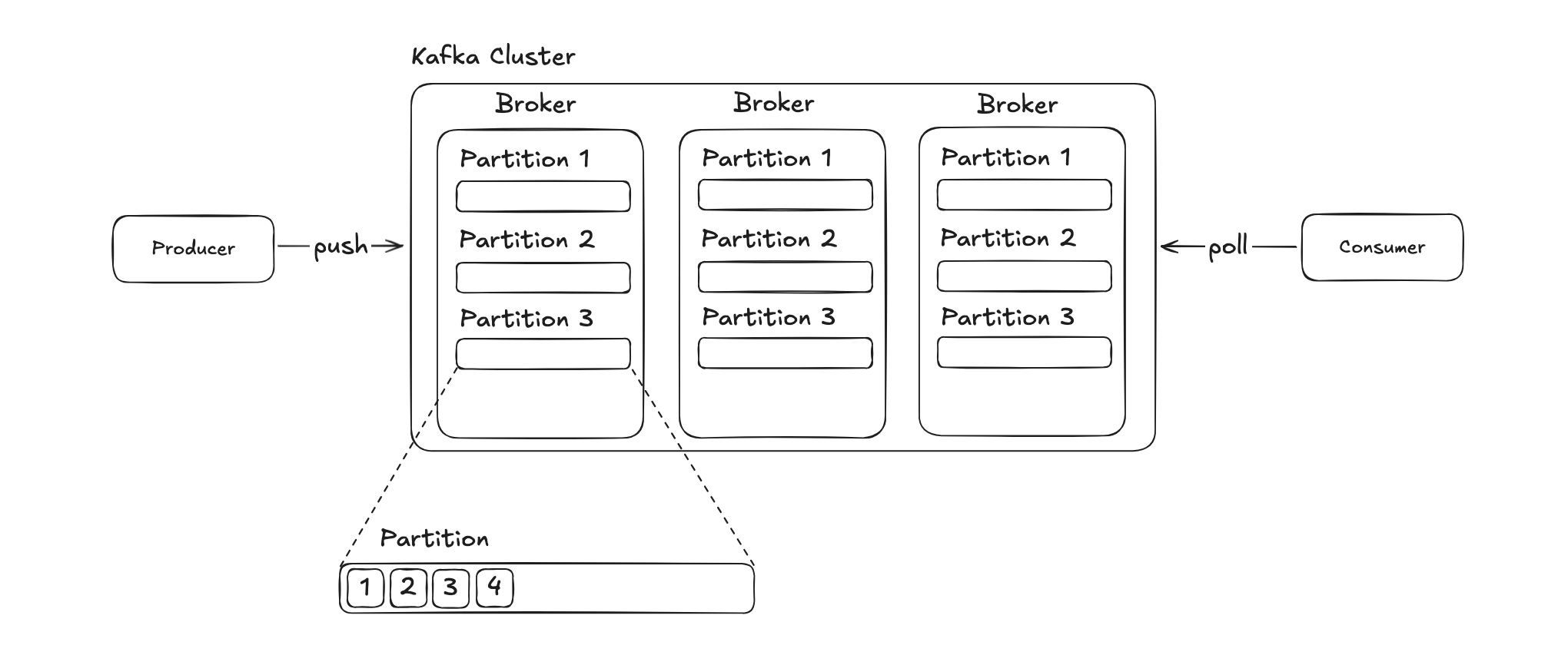 - Partition: 데이터를 병렬로 처리할 수 있도록 나누어진 구조. 내부는 FIFO처럼 동작