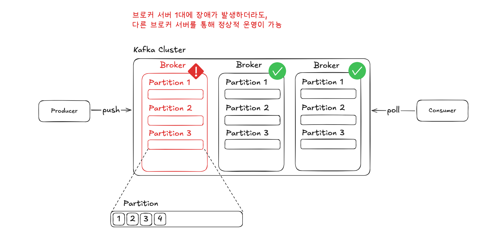 Kafka는 브로커 간 데이터 복제를 통해 일부 노드에 장애가 발생해도 지속적으로 메시지를 저장하고 전송할 수 있어, 무중단 운영이 가능한 고신뢰 데이터 파이프라인 플랫폼이다.