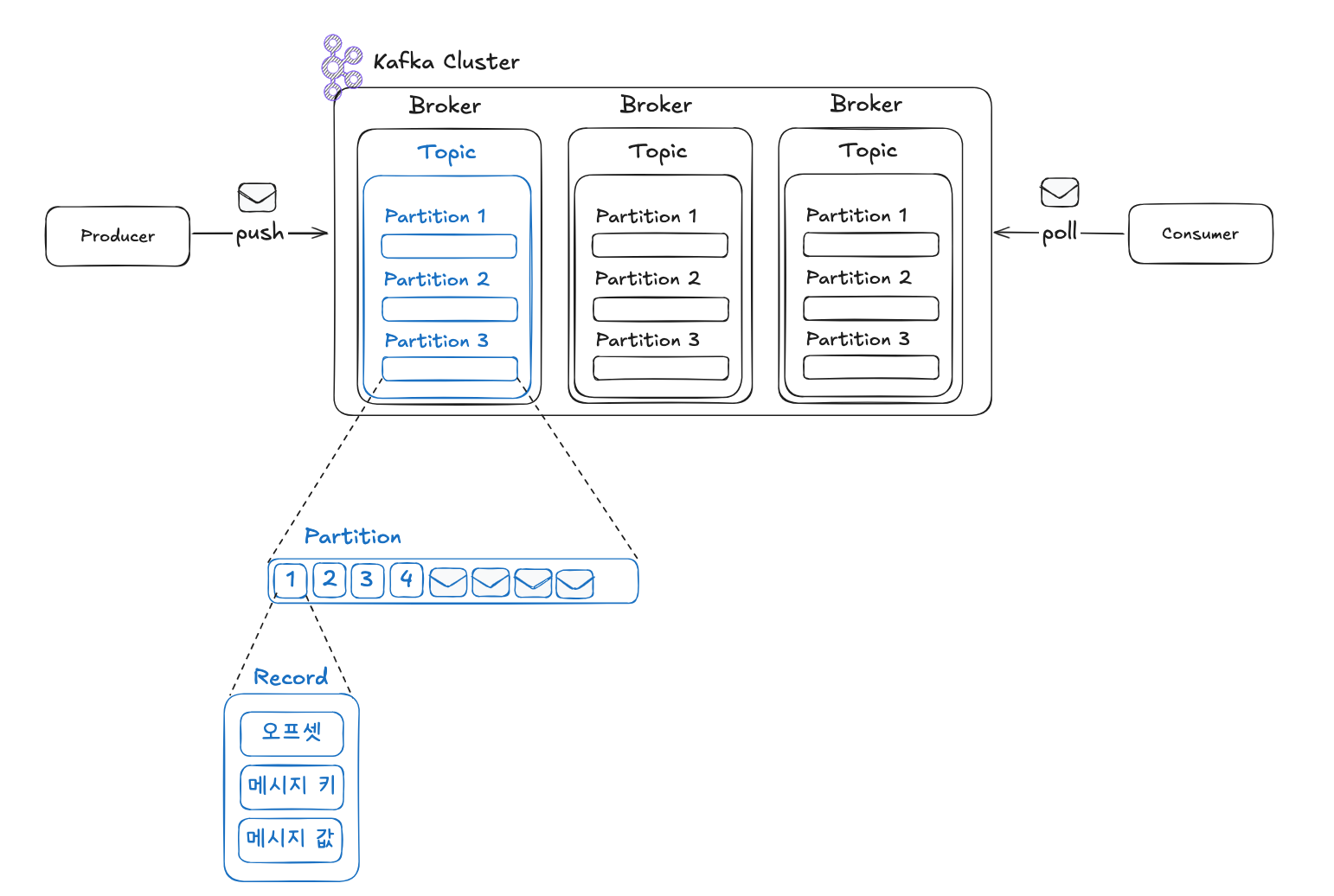 Kafka에서 프로듀서(Producer)가 데이터를 전송하면, 브로커(Broker)는 해당 데이터를 프로듀서가 지정한 토픽(Topic)의 파티션(Partition)에 저장한다. 이후, 컨슈머(Consumer)가 데이터를 요청하면 브로커는 저장된 데이터를 컨슈머에게 전달한다.