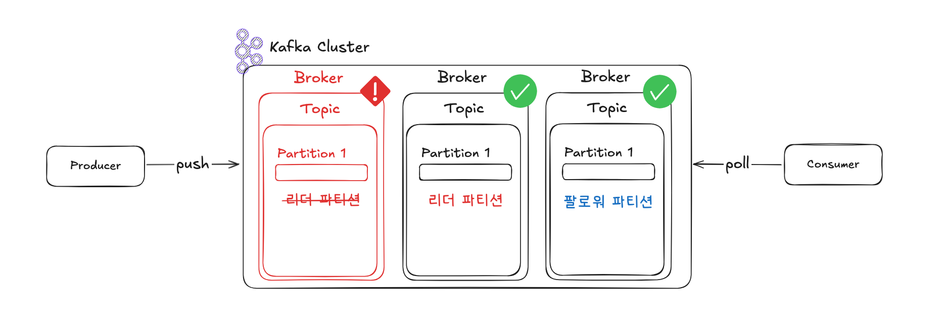 Kafka 클러스터에 브로커가 3대 존재한다고 가정했을 때, 리더 파티션을 담당하는 브로커가 장애로 다운되면, Kafka는 자동으로 팔로워 파티션 중 하나를 새로운 리더로 승격시킨다. 이를 통해 데이터 유실 없이, 컨슈머와 프로듀서가 지속적으로 데이터를 주고받을 수 있도록 한다.