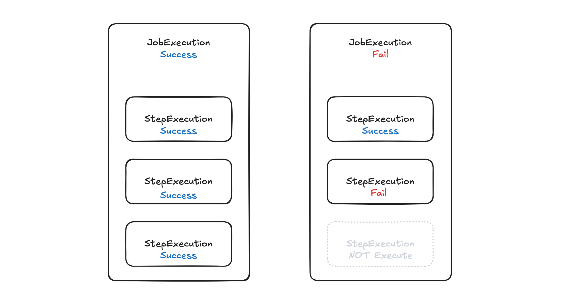 - 또한 StepExectuon이 실패하게 되면 이후 실행되는 Step들은 실행되지 않고, StepExecution도 생성되지 않습니다.