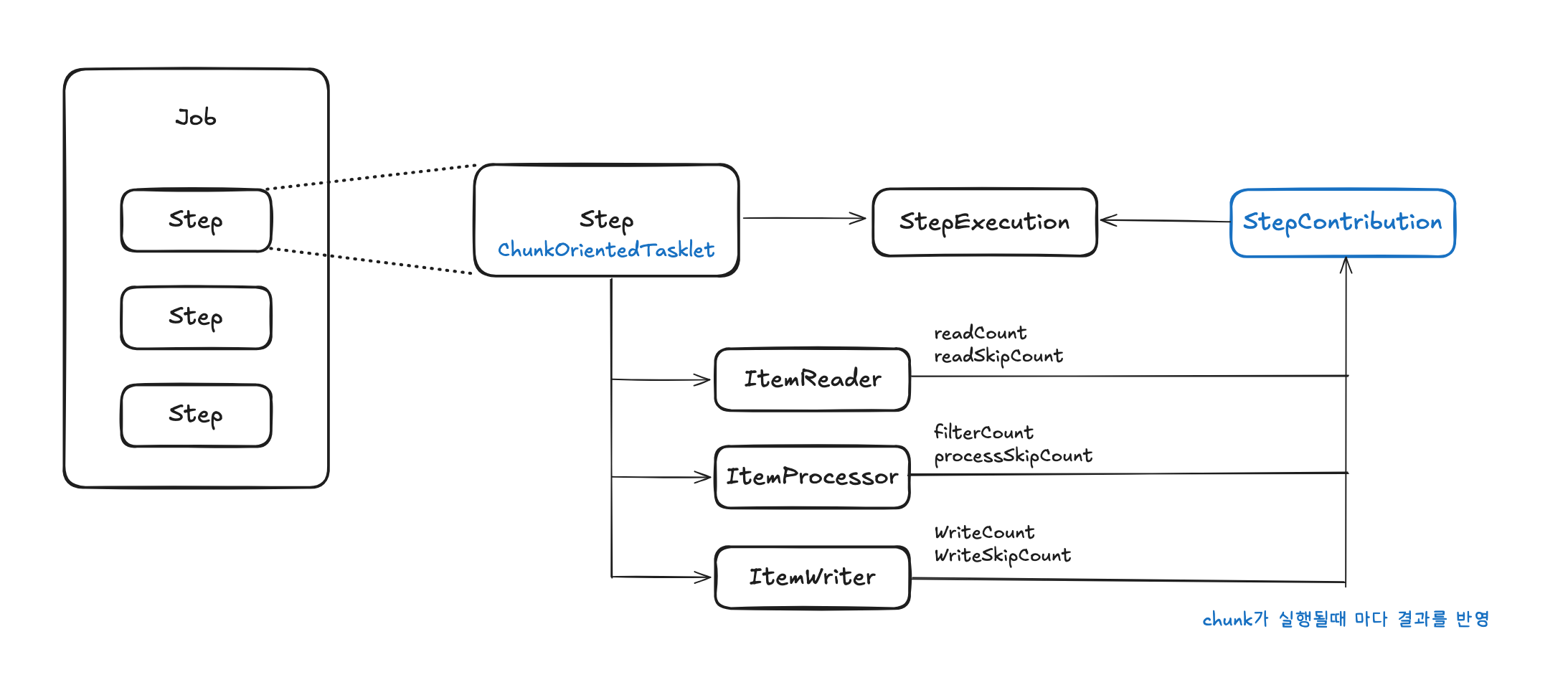- StepContribution은 그 Step을 이루는 작은 단위(청크)의 실행 결과를 기록합니다.