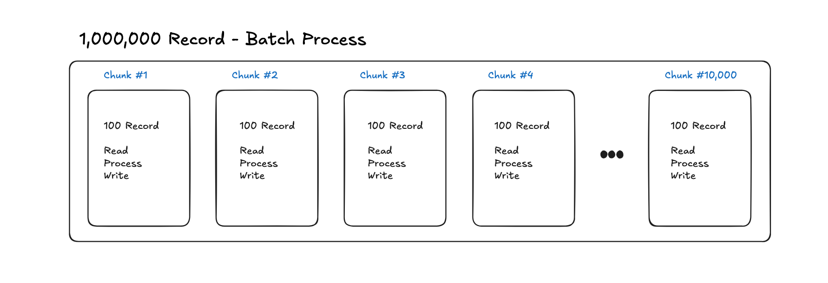1,000,000(백만)건의 데이터를 처리해야 할때, 100건씩 청크 단위로 처리한다면 10,000번만 반복하면 됩니다.
