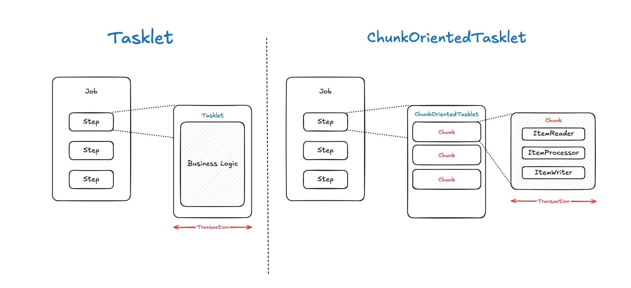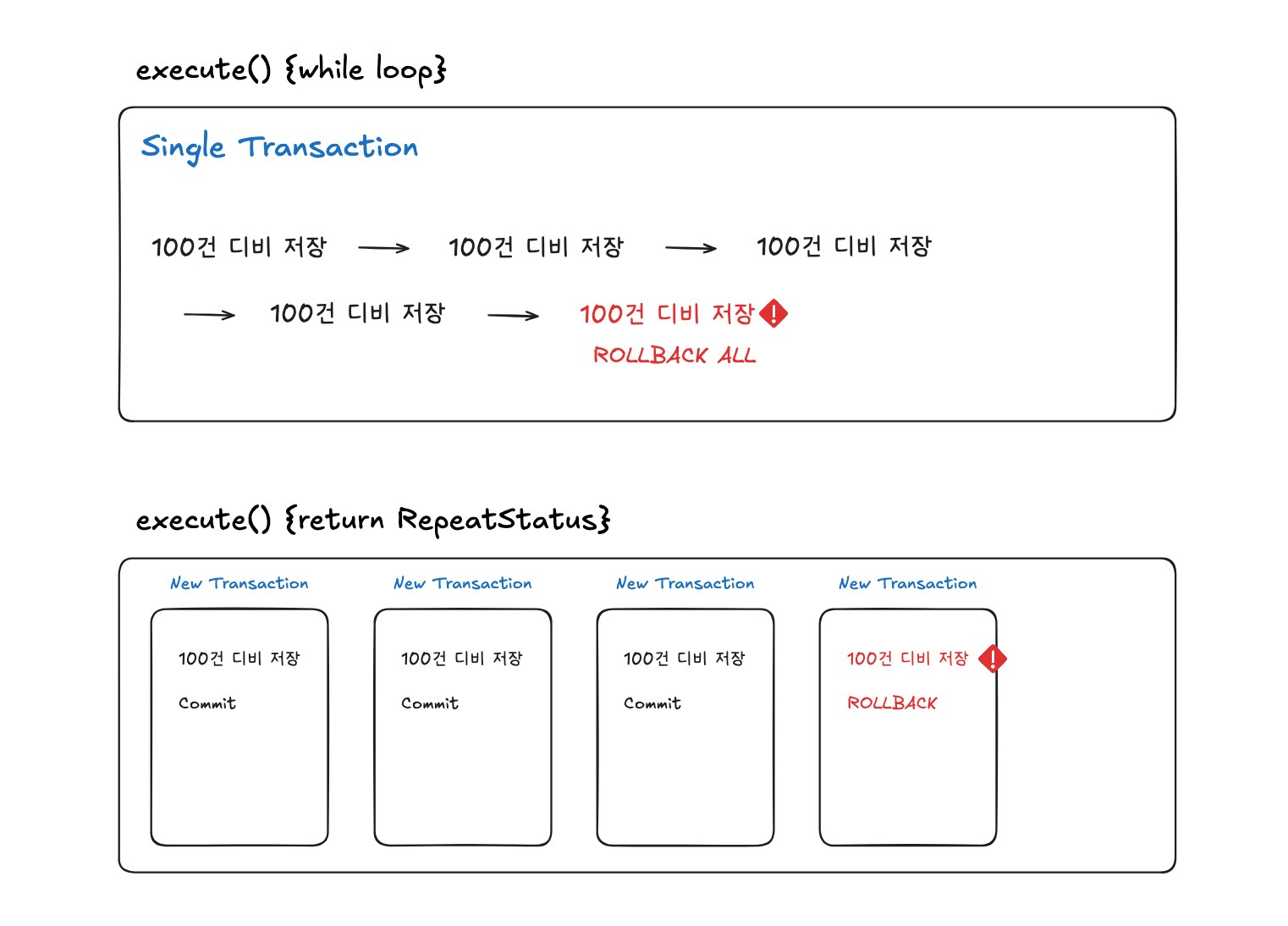 Spring Batch는 Tasklet의 execute()를 호출할 때 마다 새로운 트랜잭션을 시작하고, RepeatStatus가 반환되면 트랜잭션을 커밋 합니다. 내부에 반복문을 사용한 경우는 모든 작업이 하나의 트랜잭션 안에서 실행되는 반면, RepeatStatus.CONTINUED를 사용한 코드2는 execute마다 트랜잭션이 적용되기 때문에 작은 트랜잭션들로 나누어 안전하게 처리 할 수 있습니다.