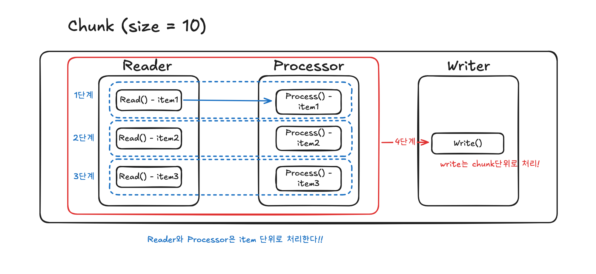 Reader와 Processor은 item 단위로 처리된다. 반면 Writer는 청크 단위(item 10개) 단위로 처리 됩니다. Reader-Processor-Writer가 한 묶음으로 반복 되는 것으로 잘못 이해하면 안 됩니다.