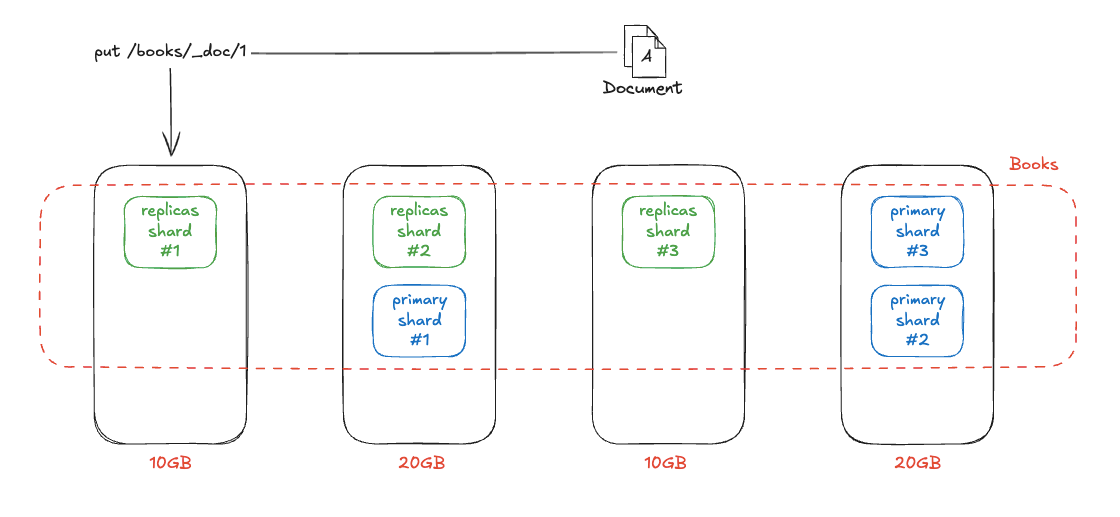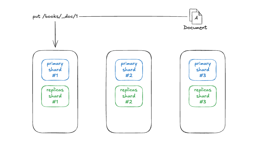 엘라스틱서치는 문서의 _id(혹은 routing key)를 해시해 고정된 primary shard를 선택합니다. 예를 들어 _id=1은 primary shard #3에 매핑되고, 이후 해당 shard의 replica shard들로 전파됩니다. 이 때문에 특정 ID 문서는 항상 같은 샤드에 저장되며, 샤드 분포가 불균형하면 성능 문제가 생길 수 있습니다.