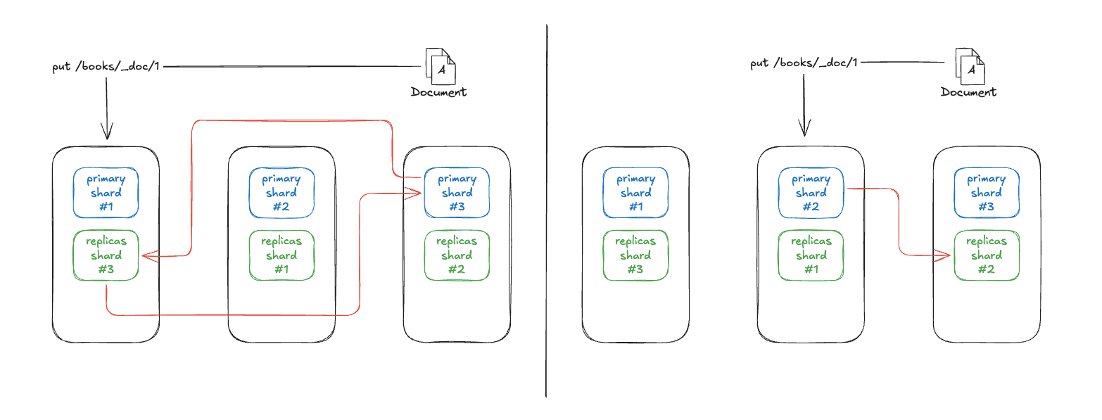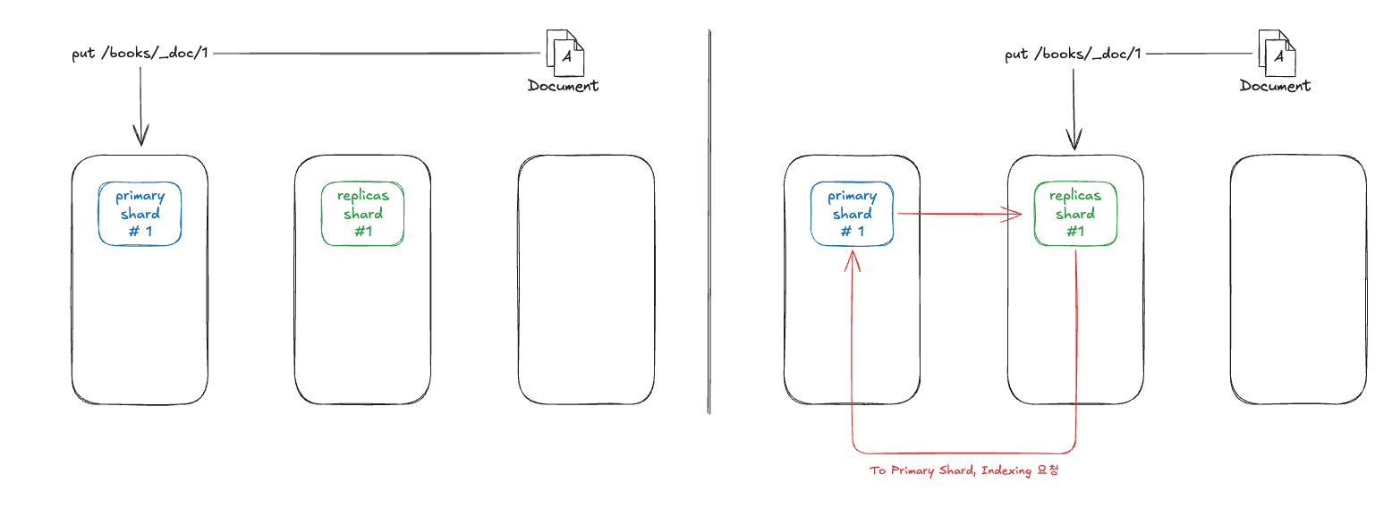색인은 Primary 샤드에서 일어 납니다. 1번 노드에 색인 요청을 하게 된다면 Primary 샤드가 있기 때문에 바로 요청을 진행하게 됩니다. 반면 2번 노드에 색인 요청을 하게 된다면, Primary 샤드가 있는 노드에 다시 색인 요청을 하게 됩니다.