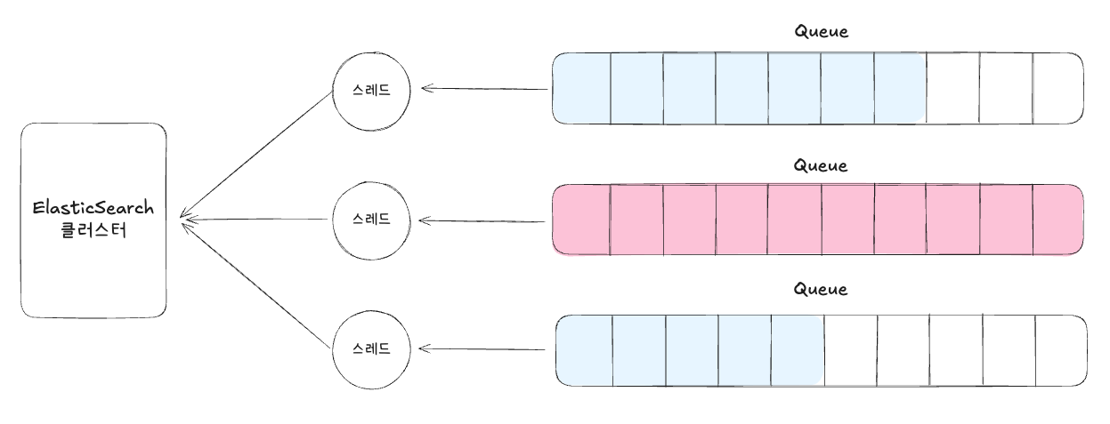 이러한 문제는 특히 대량의 색인 요청이 순간적으로 몰릴 때 자주 발생합니다. Elasticsearch는 색인 및 검색 요청을 처리하기 위해 스레드 풀(thread pool) 구조를 사용합니다. 각 스레드는 요청을 처리하며, 만약 모든 스레드가 바쁘다면 요청은 큐(queue) 에 쌓이게 됩니다.